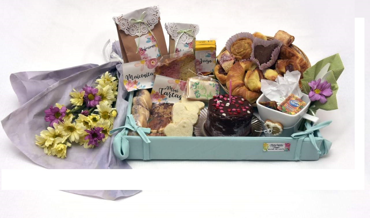 Café, té, leche, medialunas, porción de torta casera, cookies artesanales dulces, jugo de fruta, facturas, budín casero, alfajores, mermeladas de frutas (diversos motivos).