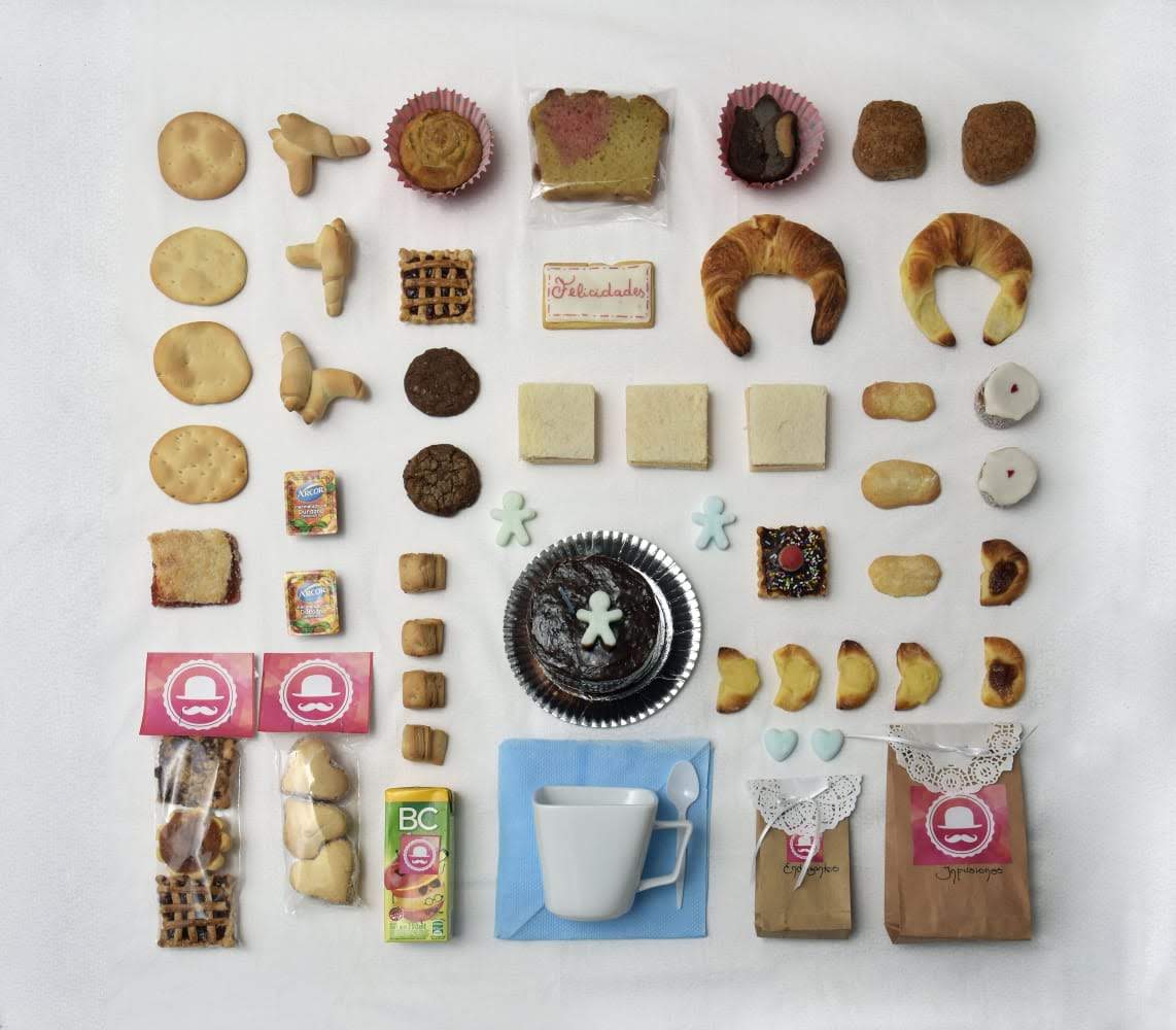 Café, té, leche, chocolatadas, medialunas, porción de torta, cookies dulces artesanales, jugo de fruta, facturas, budín casero, mermeladas de frutas, caja sorpresa, todo con motivos infantiles.